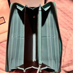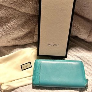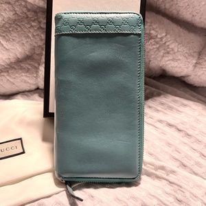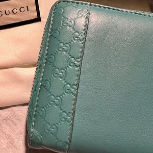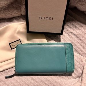 EUC GUCCI Interlocking GG Embossed Leather Zip Around Wallet in Turquoise