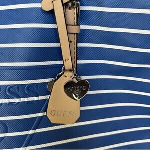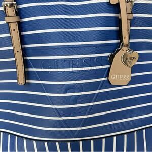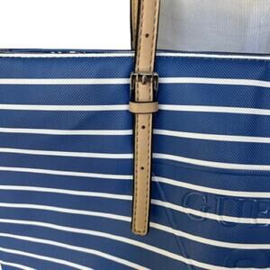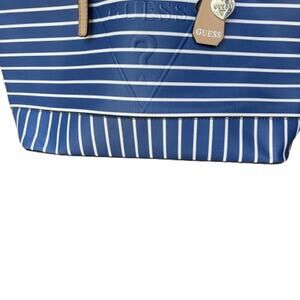 EUC GUESS Blue/White Large Zippered Shoulder Tote Bag. This bag is attractive and functional. Perfect for vacation travel. Vibrant blue and white stripe with embossed brand logo. Contrasting light beige shoulder straps. Zipper top. Logo fabric lining. Only used a few times. Preloved in excellent condition.