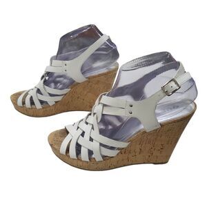 EUC GUESS WOMEN'S WHITE LEATHER PLATFORM ESPADRILLES WEDGE SANDALS, 8.5