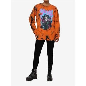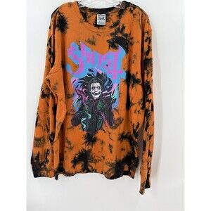 The EUC Ghost Band Cardinal Copia ORANGE Tie Dye Sweatshirt in size XXLARGE is a sold-out item featuring a pullover style with a crew neck and fleece fabric. This sweatshirt showcases a graphic print of the Ghost logo in a tie-dye pattern, making it a unique and eye-catching piece suitable for both men and women. The relaxed fit and long sleeves make it a comfortable choice for year-round wear, while the black color with orange accents adds a pop of color to your wardrobe. Machine washable and made of cotton, this sweatshirt is a must-have for fans of the metal theme.