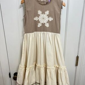 EUC Girls Tan & Ivory Linen Mustard Pie Snowflake Christmas Holiday Dress Size 6