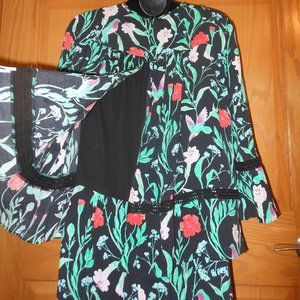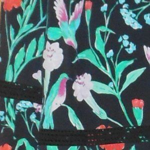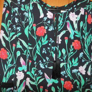 J065. Hummingbirds & flowers adorn this fun summer romper from KATE SPADE New York; lightweight fabric with crochet detail at waist and 3/4 sleeves, basted side pockets, front self-tie with tassels can be left open for V-neck styling, split back overlay to reveal black tank lining, invisible back zip, hook & eye closure. An easy, breezy beautiful garment to enjoy all season with uncompromised Kate Spade NY quality & style! Live colorfully! Rare find.