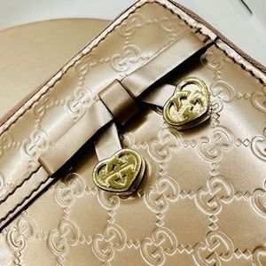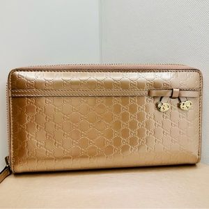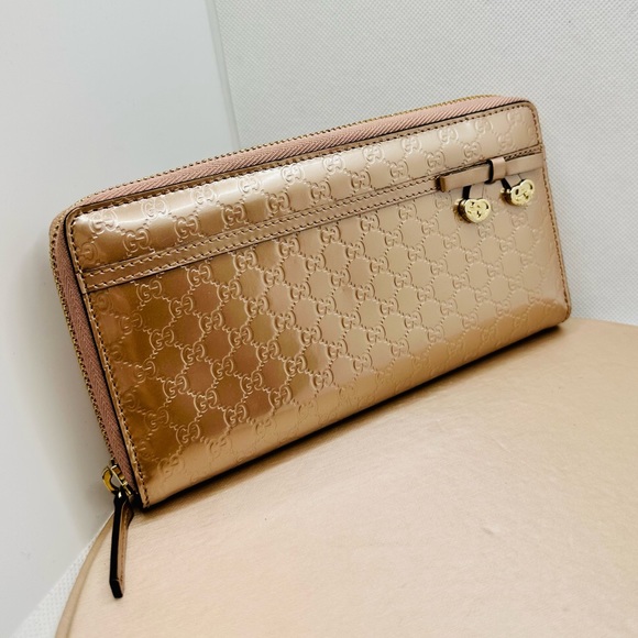 EUC Gucci Bow Heart Zip Around Microguccissima Metallic Rose Gold Patent Leather Wallet
