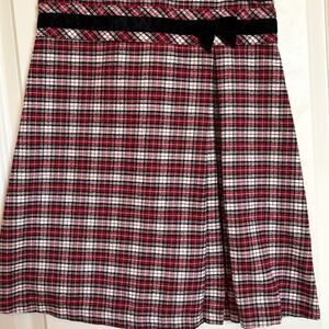 Very good condition, such a pretty dress. Black, white and red plaid. Velvet bow at the waist and and a cute pleat in the front. Zipper in the back. Great holiday dress. Comes from a smoke free home.