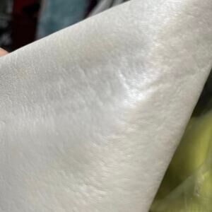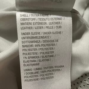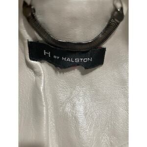 Shimmering pearl white leather moto jacket. With its off-set diagonal zip closure, perforated sleeve detailing with knit underside, and gun metal color hardware. It channels Halston’s legacy of minimalist drama w/a modern twist. Fully lined, pockets on either side. Each side of collar, just as is flips over at neck, appears to have indentations from resting on a hanger wrong for sometime. Not very noticeable, see pics. Size tag missing, however, fits me like a XL so plz see measurements.
