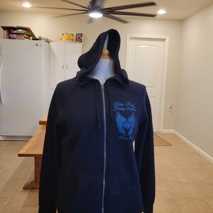 HARLEY-DAVIDSON BRAND. Chic & EDGY black hoodie with vibrant blue and purple wing graphics. VERY SOFT MATERIAL. Zip closure, tie hood. Heads will turn when you wear this stunning jacket. Very VIBRANT & BOLD colors. Teenie tiny amount of pilling. STUNNING, EDGY, CHIC.