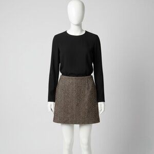 Mini skirt, A-line skirt, brown, dark brown, black, off-white, herringbone, chevron, zigzag, woven pattern, tweed, wool blend, textured fabric, fitted, structured, classic, office wear, professional attire, smart casual, fall fashion, winter style, vintage-inspired, chic, elegant, sophisticated, versatile