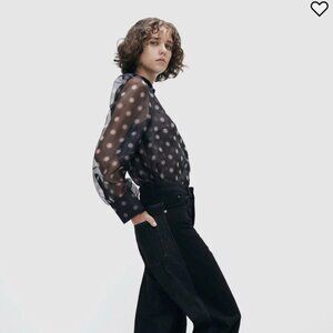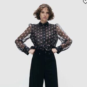 EUC H&M Studio Black Pink Organza Polka Dot Blouse with Puffed sleeves