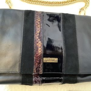 EUC Halston Heritage Black Leather suede shoulder crossbody gold chain