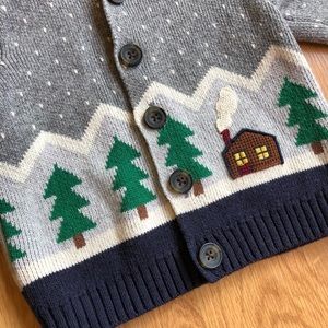 EUC Hanna Andersson Baby Boy Hooded Sweater-Gray With Buttons, Trees and Cabin