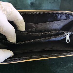♥ Zippered closure with three interior compartments; one is zippered.