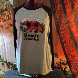 Excellent Used Condition: Holiday FamJam Sze XL Black & Red 'Bearly Awake' Pajama Set. Get cozy and festive with this Holiday FamJams "Bearly Awake" pajama set. The set features a grey long-sleeve raglan shirt with solid black sleeves and a graphic of a bear in a buffalo plaid pattern, with the text "Bearly Awake" printed below it. The matching pajama pants are a soft polyester fleece with a classic red and black buffalo check design, featuring a pull-on waist and tapered leg openings. This comfortable and stylish set is perfect for holiday gatherings or a relaxed night in.