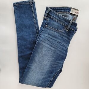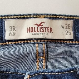 Classic Hollister jeans. Straight leg. Medium blue distress washed cotton elastane. Waist measures flat 14". 4.5" zipper rise. 28.5" inseam. Size 3r (26wx29l) EUC