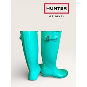 Step out in style no matter the weather with these iconic Hunter Original Tall Rain Boots in the vibrant Tiffany Blue color, style code WFT1000RGL. Crafted from high-quality waterproof rubber, these wellingtons are designed to keep your feet dry and comfortable on rainy days. The classic silhouette hits just below the knee, making them perfect for pairing with jeans or leggings for both practical use and fashion-forward looks.