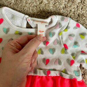 This adorable Cat & Jack dress is the perfect blend of cozy and cute for your little one. Designed for ages 3–6 months, it features a soft gray knit top with glittery heart patterns and a bright coral tulle skirt that adds the sweetest pop of color. The back button closure makes dressing easy, and the lightweight fabric ensures comfort for all-day wear. It’s a great choice for special occasions or everyday sparkle — in excellent pre-loved condition!