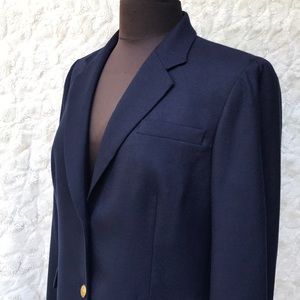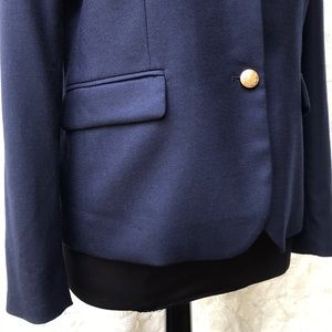 Like New J. Crew Navy Keating Boy Blazer. Two gold ensigna buttons secure front with four same overlapping buttons at cuffs. Two front flap pockets and kerchief pocket. Fine wool blend in deep navy. Fully lined. Perfect blazer for professional attire or jeans and flats.