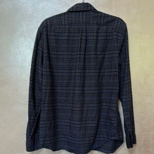 J.Crew shirt with blue and gray and black checkered pattern. Classic collar and button-up style.