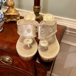EUC Jack Rogers Marbella Metallic Platinum Wooden Wedge Thong Sandals Size 9.5 M