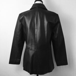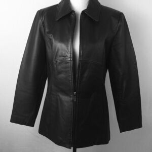 EUC Jacqueline Ferrar Genuine Leather Black Jacket . Sz M. Fully Lined. Sleeves. Collar. Front Zipper Open/Closure. Some shoulder padding. Front Pockets. Lining 100% Polyester. Measurements Approx Laying Flat Are: