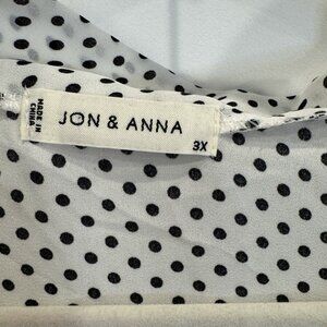 Chic and timeless, this Jon & Anna 3X sleeveless blouse is in excellent condition. It features an allover black polka dot print on a white base with a flattering tie‑neck detail. This sheer top is flowy, wrinkle‑resistant, and has a relaxed fit that works beautifully tucked into skirts or worn loose with trousers or denim. Great addition to a workwear wardrobe or date‑night outfit. Approximate measurements: 25 in. armpit to armpit; 24.5 in. length. Please ask all questions prior to purchase.