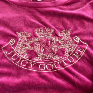 Description: This is a set, you will receive both the top and bottom! Large Juicy written on side of leg of one pant. Juicy Couture spelled out on top with embroidered logo in gold metallic stitching. External drawstring on pants. Tapered jogger style pants. Crew neck long sleeve sweater top.