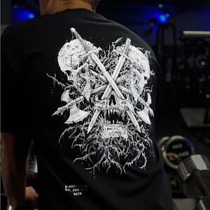 Back features skulls with swords and the saying “To understand pain, you must know pain”