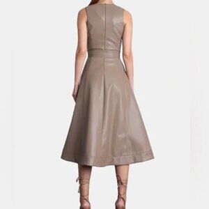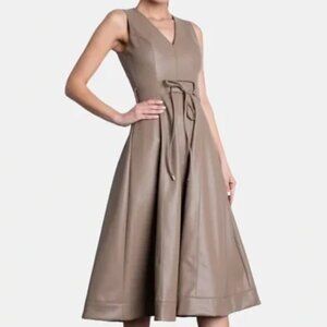 Dress to impress with Karina Grimaldi's Honoria Midi Vegan Leather Dress. Made with soft, sustainable vegan leather, this dress features a flattering v-neck line, Belt tie around the waist, and a midi length that exudes elegance. Make a statement in this must-have dress.