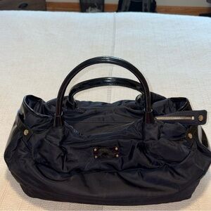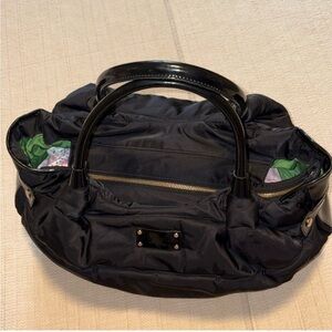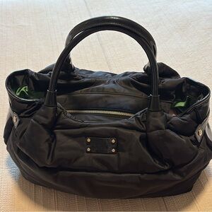 Quilted black nylon bag with patent leather trim & handles. Interior features one zipper pocket & two slip pockets. Clean - minor scuffs on the bottom.
