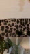 Exterior: The clutch features a brown and black leopard print pattern on a genuine haircalf exterior, complemented by black leather trim. It is accented with a fixed black leather bow and a small, gold-toned logo plate.