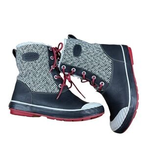 Stylish winter boots with red laces. Black leather with herringbone pattern. Cozy white lining.