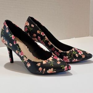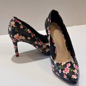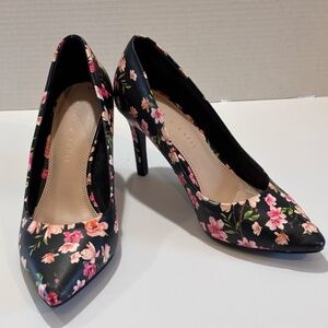 EUC Kelly & Katie SZ 7 Pointed Toe Shoes Black Floral Print Heels Pumps
