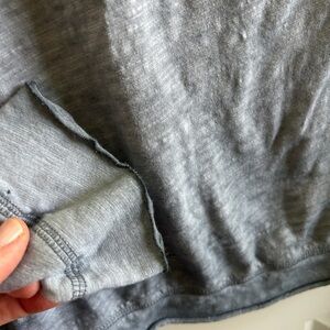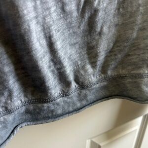 L scoop neck tee. Grey green heather. Rolled neckline, cuffs, and bottom hem. Effortless. Comfortable. Layer. Cropped but not super cropped. Boxy. Comfy.