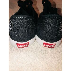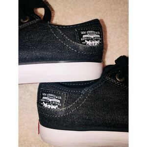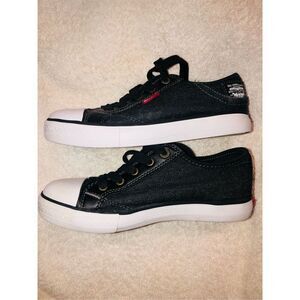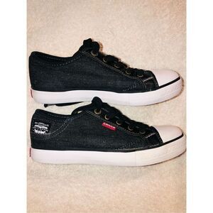 Excellent Used Condition Kids Size 2 Levi’s Denim Lace Up Sneakers. White Rubber Around Shoes Is Bright White With No Marks Or Stains. Minor Wear On Bottom. Have Been Machine Washed Prior To Sale. Smoke Free Home. #levis #levissneakers