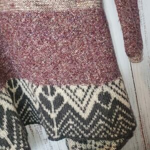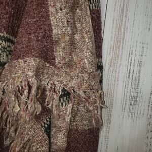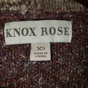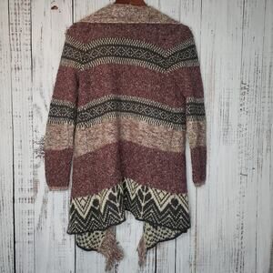 Excellent used condition, beautiful Knox Rose open front cardigan, waterfall hem, fringed edges, multicolored striped yarn. Oversized fit. Burgandy, cream and charcoal. Size XS. From my smoke-free and pet-free home.