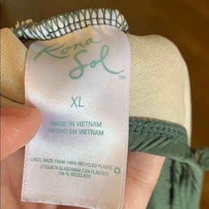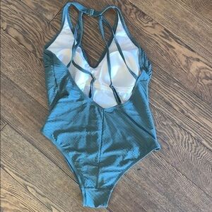 EUC Kona Sol olive green one piece with cup bra, removable pads, and hook in back is comfortable and flattering on. No damage, stains, or odor. Smoke free home.