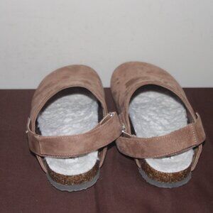 In very good, gently worn condition. Tan sueded fabric uppers with an adjustable strap behind the heel. Fur lined and a textured rubber soles. Size 8 1/2