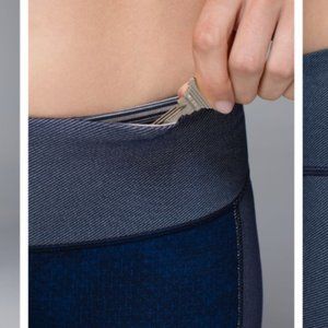 This is an excellent used condition Lululemon Wunder Under Cropped Pant in Sashico Inkwell Blue / Patch.