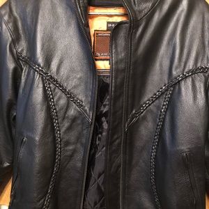 Hardly worn, ladies bike jacket w full zipper lining; braid trim, pockets