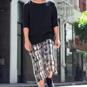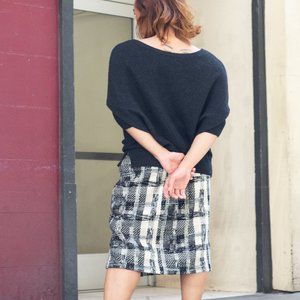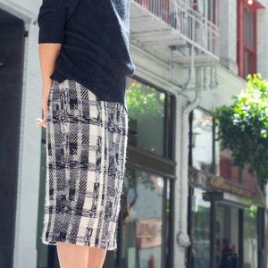 Really gorgeous modernist wool plaid skirt with vegan leather piping along the waist and down the front left side. This garment is so versatile and is easily your go-to this fall and winter -- heels, flats, boots -- do it all! No flaws and this beauty comes from a smoke free home. Retail $498