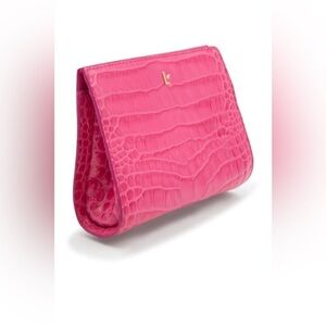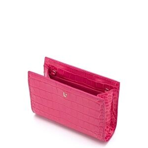 Larroude Erin Clutch Mini Evening Bag in Bright Pink Stamped Leather w Gold Chain. Originally $325. Excellent preowned condition (please see all photos).