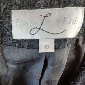 EUC Beautiful Laura Leigh Ltd Women's Wool Blazer and Skirt Set Size 10. This matching outfit is black and Tan, very professional and perfect for a work meeting or special event. The Blazer measures 19 inches armpit to armpit and 30 inches in length. The Skirt measures 15 inches at the waist and 24 inches in length.