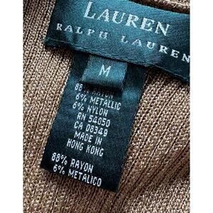 Add a touch of elegance to your wardrobe with this Lauren Ralph Lauren metallic gold cardigan. Crafted with a soft ribbed knit fabric, it features a subtle shimmer perfect for both day and evening wear. This classic V-neck design is versatile enough to layer over dresses or pair with jeans for an elevated casual look.
