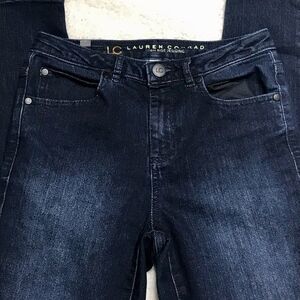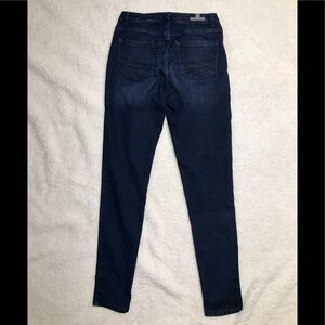 Dark blue lighter weight denim Jegging has heavy duty zipper and single button closure. Five functioning pockets.