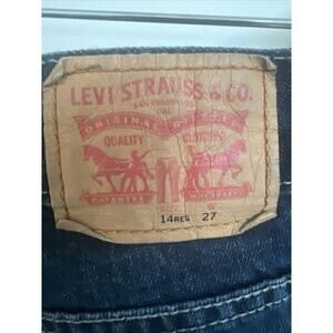 These Levi's 505 jean shorts are perfect for any young boy who loves to play, go to school, or take a walk. The shorts come in a stylish dark blue color and feature a zip and button closure for a secure fit. With a regular fit and waist size of 27 inches, these shorts are comfortable and versatile enough to wear for any activity.