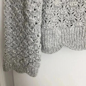 Cute scalloped hem at bottom and sleeves. Pretty lightweight. A bit of a boxy fit.