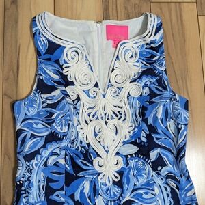 EUC! Lilly Pulitzer Gabby Stretch Shift Dress in High Tide Navy You're The Zest, women's size 4. Beautiful! This is a great dress to wear on the casual or to a more formal event. It has a lovely floral print with white embroidery around the neckline. The back has a zip up closure. Measurements are shown in the photos. It comes from a smoke and pet free home. No defects found upon final inspection. Message me if you have any questions. Enjoy!