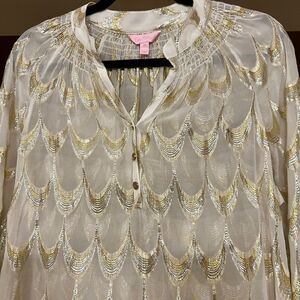 EUC Lilly Pulitzer Metallic Semi Sheer Elsa Blouse Top Ivory Gold Silver Size XS