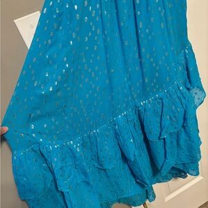 Lily Pulitzer Valeri midi dress in beautiful aqua with gold accents. Worn only once for a cruise. Elastic cinched waist with ruffle skirt.