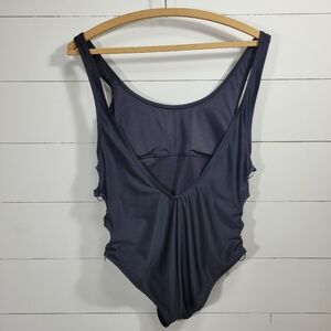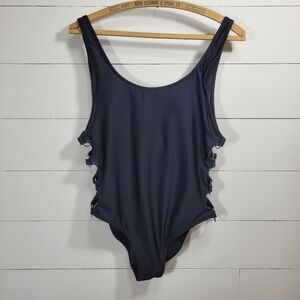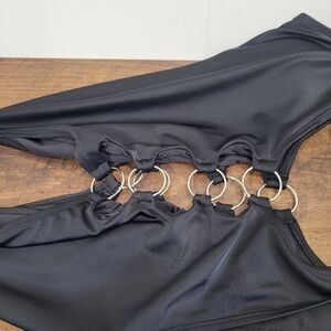 pre-loved, gently worn, great condition,. Poly/spandex blend, tank style straps with low back, light bra padding, cut out sides with silver rings embellishment, high cut.