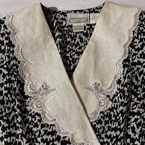 This is an EUC Liz Robert’s Vintage Butterfly Dress with Eyelet Collar. A Butterfly design with a flattering V neckline. A cream and black color combination with a pleated bottom. Dressy/Office.